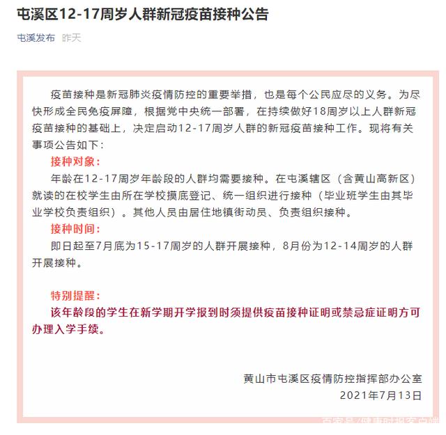 7月13日,安徽省黃山市屯溪區(qū)疫情防控指揮部發(fā)布《12-17周歲人群新冠疫苗接種公告》稱,決定啟動12-17周歲人群的新冠疫苗接種工作,年齡在12-17周歲年齡段的人群均需要接種。該年齡段的學(xué)生在新學(xué)期開學(xué)報到時須提供疫苗接種證明或禁忌癥證明方可辦理入學(xué)手續(xù)。